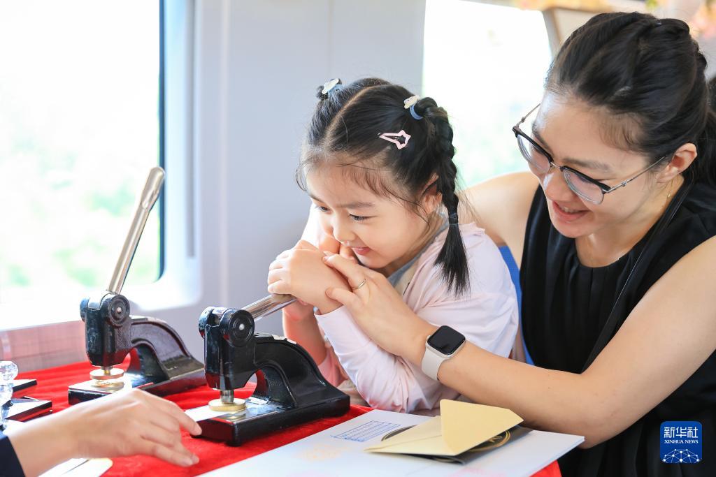 8月8日,在G132次列車上,家長和孩子一起體驗(yàn)鋼印制作書簽。