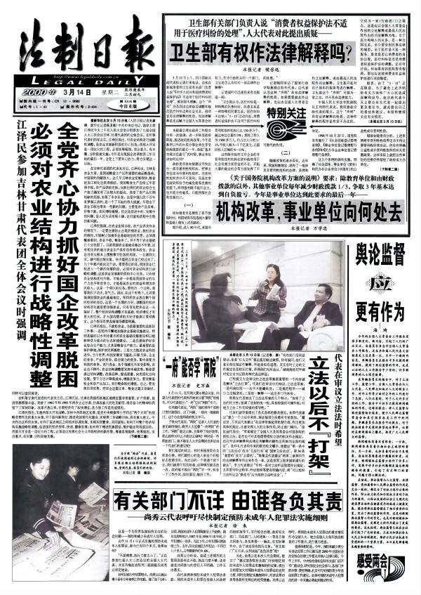 2000年九屆全國人大三次會(huì)議期間,我作為上會(huì)記者采寫《衛(wèi)生部有權(quán)作法律解釋嗎》,報(bào)道全國人大代表對(duì)衛(wèi)生部此前聲稱“消費(fèi)者權(quán)益保護(hù)法不適用于醫(yī)療糾紛處理”很不理解,法學(xué)專家也不贊同,認(rèn)為這種“聲明”具有法律解釋性質(zhì),衛(wèi)生部只能對(duì)自己頒布的規(guī)章等進(jìn)行解釋,這個(gè)“聲明”并不具有法律效力。此報(bào)道刊于《法制日?qǐng)?bào)》2000年3月14日一版報(bào)眼。次日又發(fā)追蹤報(bào)道《衛(wèi)生部向人大代表作解釋》。第三天衛(wèi)生部來人向本報(bào)作解釋,第三篇《衛(wèi)生部向本報(bào)作解釋》未能發(fā)出。