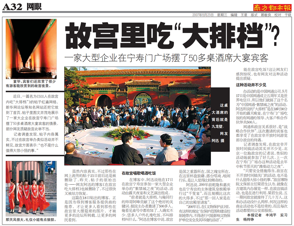 2007年5月17日,作為國務(wù)院新聞辦網(wǎng)絡(luò)局人員,受命參加當(dāng)時(shí)中國網(wǎng)通公司在故宮搞的成立五周年活動(dòng),認(rèn)為在重點(diǎn)文物保護(hù)單位大張旗鼓搞此種活動(dòng)涉嫌違反文物保護(hù)法。遂將所拍部分照片配文,“故宮是國之重器所在,國之瑰寶所在,在這里杯盤狼藉、搭臺(tái)唱戲、喧鬧行樂,是讓人覺得比較稀奇的”,次日在新浪博客發(fā)出。新浪博客即以《大風(fēng)中故宮飯局龍門陣》為題推薦至首頁,閱讀量很快超過20萬,熱度較高。新華網(wǎng)發(fā)展論壇等轉(zhuǎn)推至首頁,《南方都市報(bào)》為此作了專題報(bào)道《故宮里吃“大排檔”?》,引起更大關(guān)注,人們普遍質(zhì)疑活動(dòng)不當(dāng)。