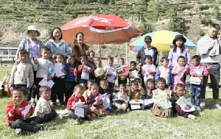 圖為四川省若爾蓋縣人民法院督察室主任更措(后排左二)與包村干部陪同塔爾村小朋友過“六一”兒童節(jié),并以籌集的資金為小朋友購買學習用品和生活物資。資料照片