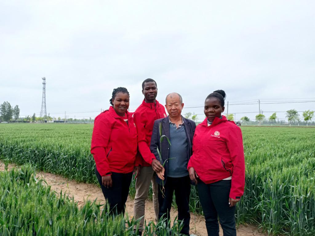 “中非科技小院”留學(xué)生庫(kù)瓦莉(左一)和同學(xué)們?cè)谖挥诤颖鼻艿霓r(nóng)戶試驗(yàn)田和當(dāng)?shù)剞r(nóng)民學(xué)習(xí)農(nóng)業(yè)生產(chǎn)技術(shù)間隙合影(5月10日攝)。新華社發(fā)(受訪者供圖)