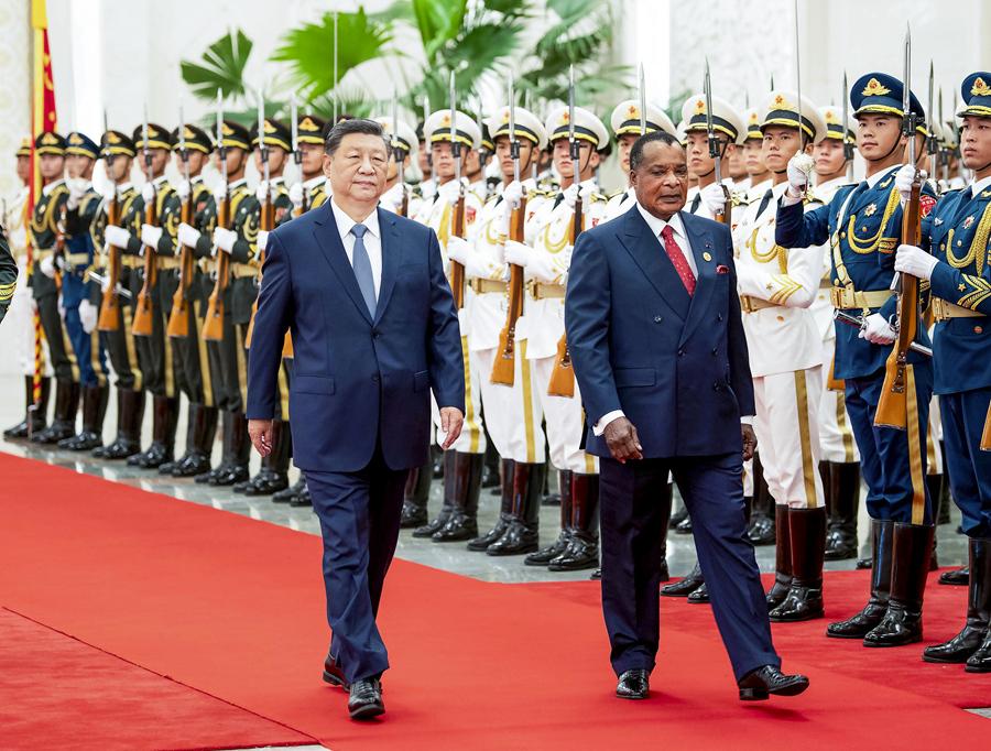 9月6日上午,國家主席習(xí)近平在北京人民大會(huì)堂同來華出席中非合作論壇北京峰會(huì)并進(jìn)行國事訪問的剛果(布)總統(tǒng)薩蘇舉行會(huì)談。這是會(huì)談前,習(xí)近平在人民大會(huì)堂北大廳為薩蘇舉行歡迎儀式。