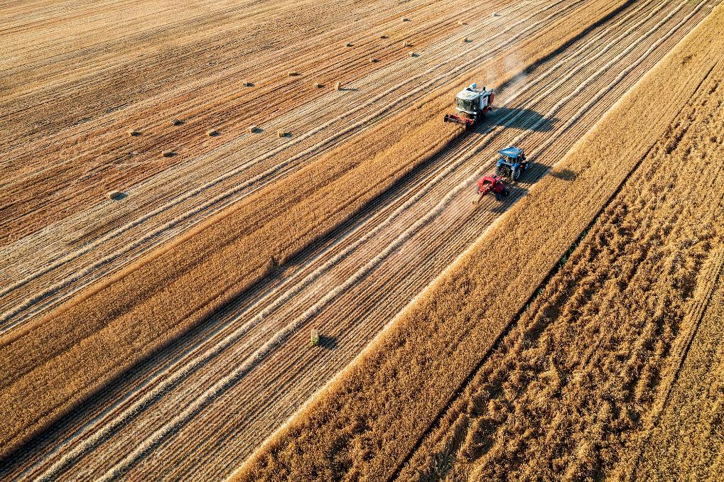 2024年5月27日,農(nóng)機(jī)手駕駛農(nóng)機(jī)在河南省商丘市梁園區(qū)孫福集鄉(xiāng)崔樓村收獲小麥(無(wú)人機(jī)照片)。新華社發(fā)(李恒 攝)