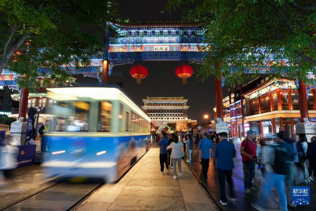 游客在前門大街和正陽門箭樓前參觀游覽(9月26日攝)。