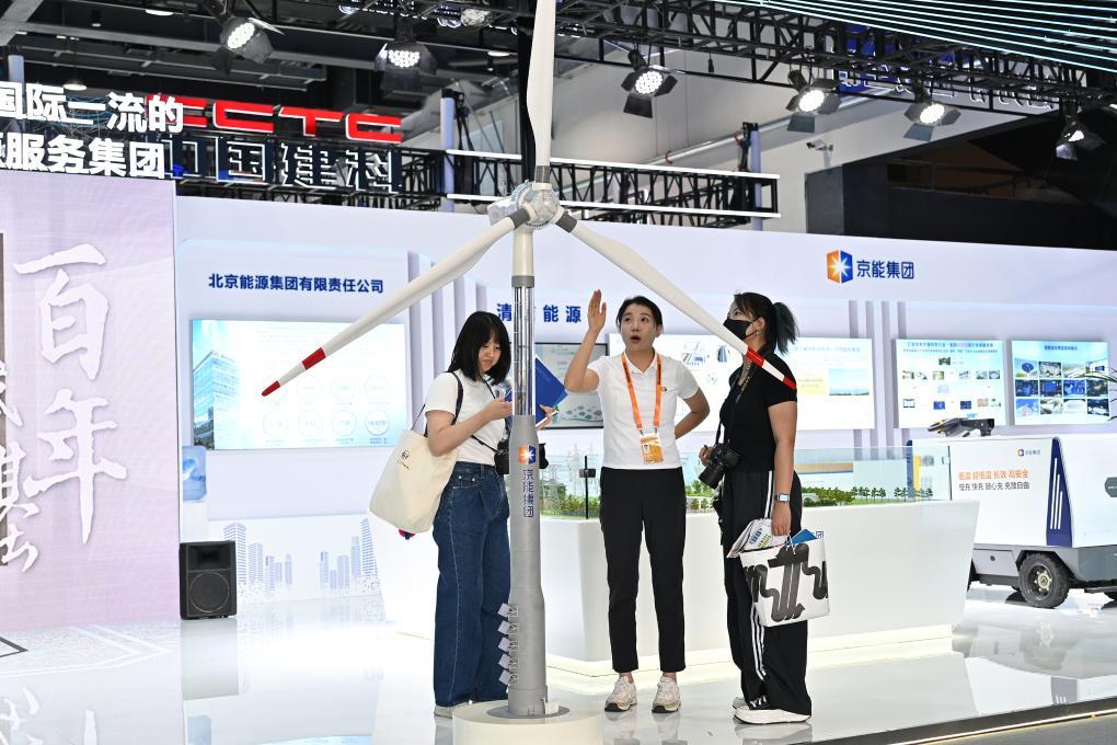 參觀者在服貿(mào)會首鋼園區(qū)京能集團(tuán)展臺觀看一款新型風(fēng)機模型。新華社記者 李鑫 攝