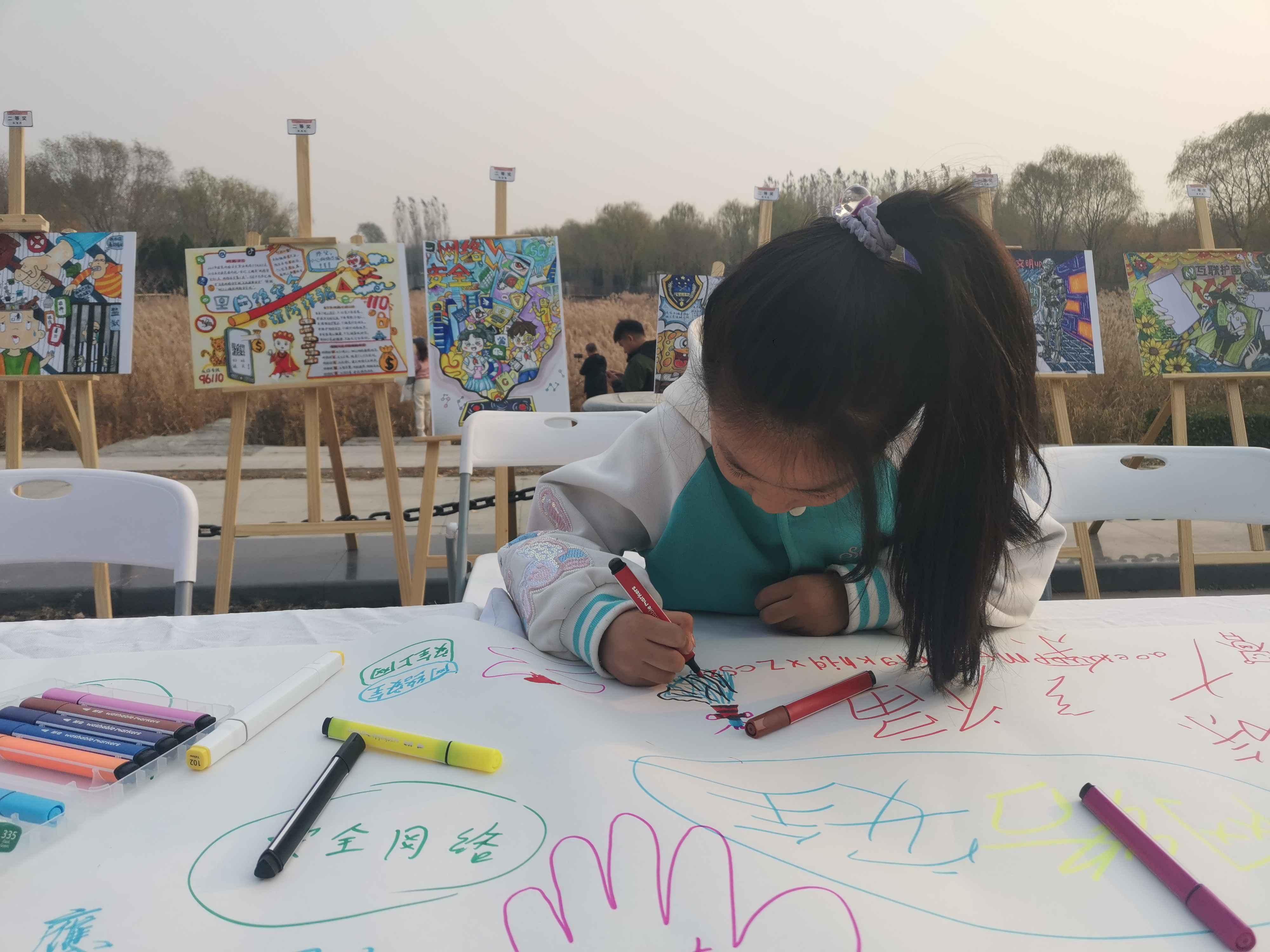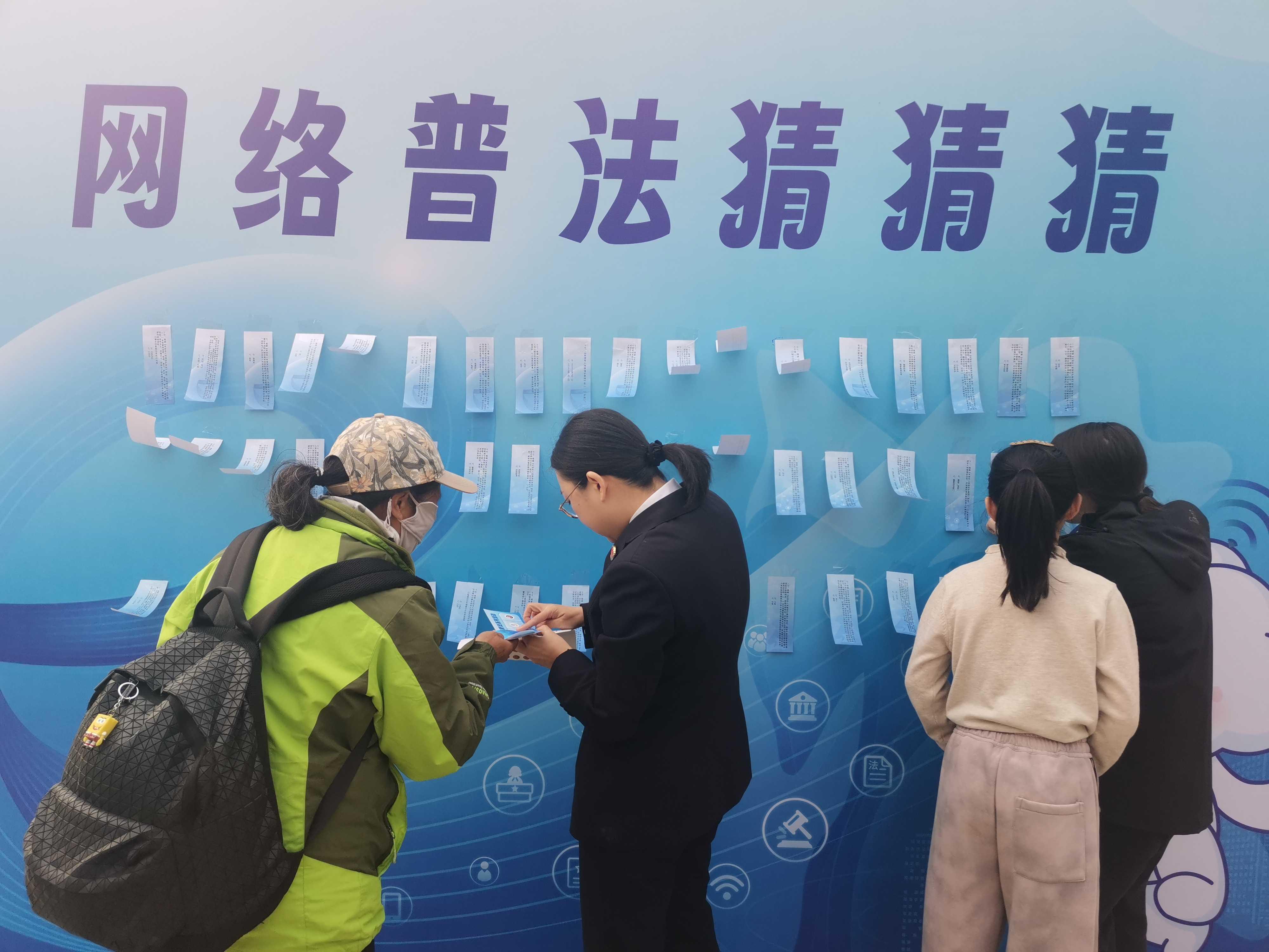 猜謎語、繪圖畫、拼拼圖、玩游戲……11月9日下午,北京市通州區(qū)臺湖公園內(nèi)人聲鼎沸、熱鬧非凡,由北京市委網(wǎng)信辦主辦,通州區(qū)委網(wǎng)信辦承辦,通州區(qū)人民法院、通州區(qū)人民檢察院、通州區(qū)教委以及臺湖鎮(zhèn)人民政府協(xié)辦的“e法潤京華·運河平安獸 護網(wǎng)凈萬家”網(wǎng)絡普法游園會正如火如荼地進行。記者在現(xiàn)場看到,人們駐足觀看普法短劇并爭相和劇中的小主人公合影、在普法展板前聽檢察官以案講法、在網(wǎng)絡普法像框墻前打卡留念,在手繪布上畫下對網(wǎng)絡安全和文明上網(wǎng)的理解與期盼。而現(xiàn)場設置的網(wǎng)絡普法猜猜猜、普法拼圖大挑戰(zhàn)、網(wǎng)絡普法飛行棋等闖關游戲更是引起眾多小朋友的興趣和熱情,每個游戲區(qū)前都排起了長隊,在歡聲笑語中,針對未成年人的網(wǎng)絡保護知識也在孩子們心中扎根發(fā)芽。