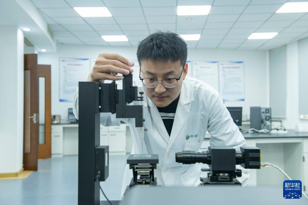 研究人員在浮法玻璃新技術(shù)國(guó)家重點(diǎn)實(shí)驗(yàn)室利用接觸角測(cè)量?jī)x檢測(cè)鍍膜玻璃親疏水性(11月8日攝)。
