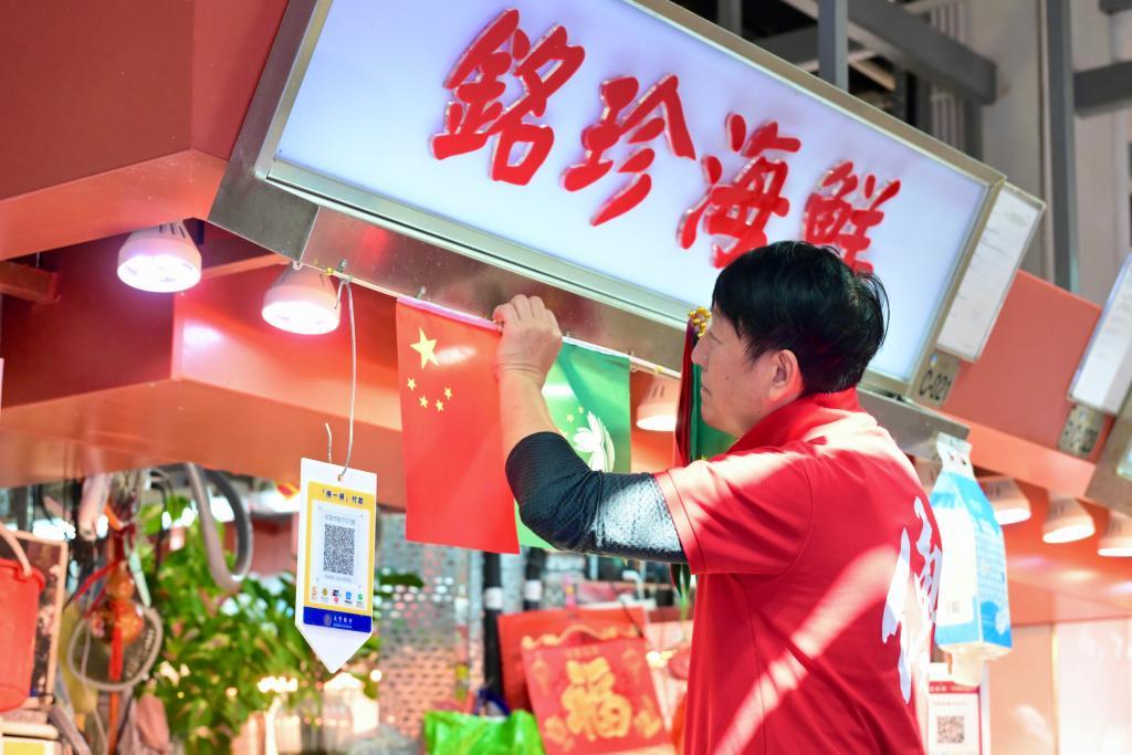 澳門紅街市的一家魚檔業(yè)主關(guān)偉銘在檔位上掛起嶄新的國(guó)旗區(qū)旗,還特意穿上喜慶的衣服?!傲?xí)主席的惦念,讓澳門人都非常感激。我寫了一副對(duì)聯(lián):‘盛世龍傳鏡海興,街市當(dāng)紅百業(yè)旺’,想告訴習(xí)主席,我們的日子越來越紅火?!彼f。