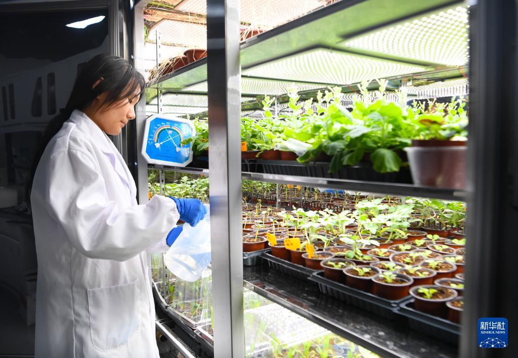 12月25日,在位于河南新鄉(xiāng)的中原農(nóng)谷實驗室,中國農(nóng)科院中原研究中心科研人員給植物光照培養(yǎng)箱內(nèi)的樣本澆水。