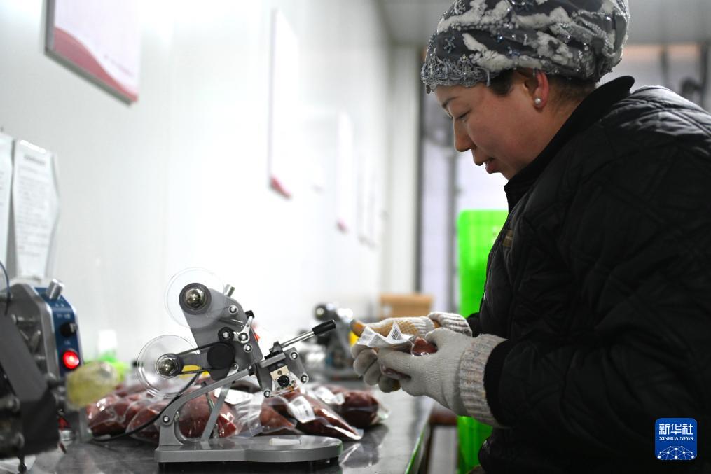 1月6日,工作人員在寧夏固原市涇源縣源牛農牧科技有限公司為黃牛肉產(chǎn)品貼標簽。