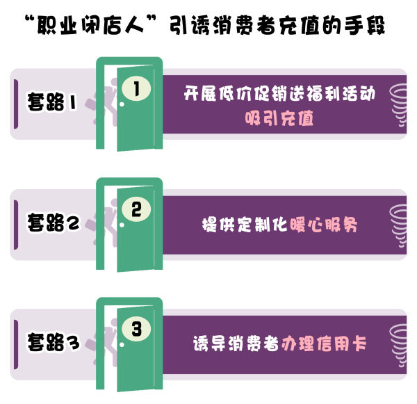 為了讓消費(fèi)者掏錢(qián),“職業(yè)閉店人”們可謂無(wú)所不用其極:一是打出“開(kāi)業(yè)促銷(xiāo)送福利”的口號(hào),以?xún)?yōu)惠的價(jià)格引誘消費(fèi)者充值。二是提供“定制化暖心服務(wù)”,培訓(xùn)銷(xiāo)售、教練為不同年齡層、不同性別消費(fèi)的者提供情緒價(jià)值,以貼心舉動(dòng)引誘消費(fèi)者充值。三是推出信用卡特惠充值活動(dòng),“職業(yè)閉店人”通過(guò)勸說(shuō)消費(fèi)者參加店鋪與銀行的聯(lián)名活動(dòng),讓消費(fèi)者辦理信用卡,隨后告知消費(fèi)者凍結(jié)信用卡便可升級(jí)會(huì)員,在消費(fèi)者凍結(jié)信用卡后刷卡提現(xiàn)。