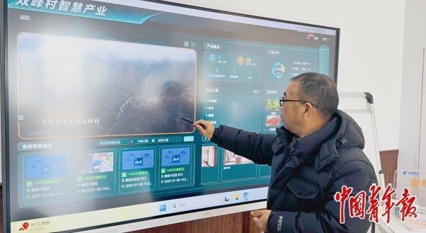 1月8日,雙峰村村支部書記陳家凱通過村里的智慧大屏查看村中的智慧產(chǎn)業(yè)。中青報(bào)·中青網(wǎng)見習(xí)記者 趙麗梅/攝
