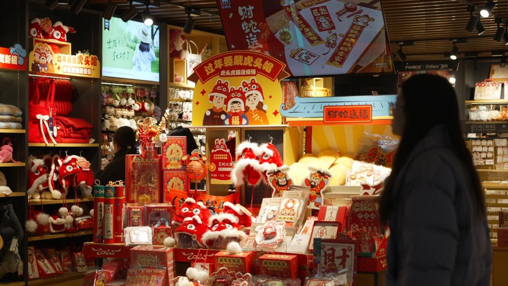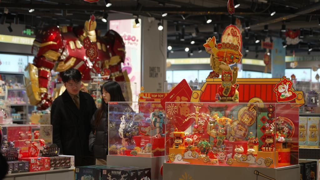 “閑來逛市場,年貨盡琳瑯?!背允呈悄晡叮b飾是彩頭,年貨市場紅紅火火。在江西南昌一商超內(nèi),購置年貨的消費者人頭攢動。不遠處一家潮玩店也是門庭若市,店內(nèi)潮流人偶戴上“財神帽”,顆粒拼裝的積木花蕊在枝頭綻放,舞獅、錦鯉、招財貓等節(jié)日“使者”穩(wěn)居C位……