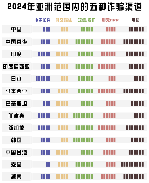 從GASA發(fā)布的《2024年亞洲詐騙報告》來看,在13個國家及地區(qū)中,犯罪分子實施詐騙的渠道通常有如下五種:電子郵件、社交媒體、短信及短訊、聊天APP、電話。