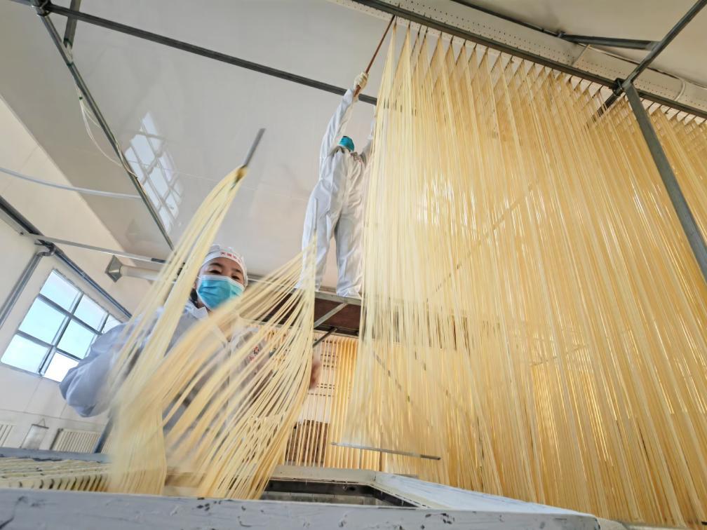 1月16日,在古浪縣泗水鎮(zhèn)的一家手工掛面生產(chǎn)車間,工人在制作掛面。新華社記者 王朋 攝