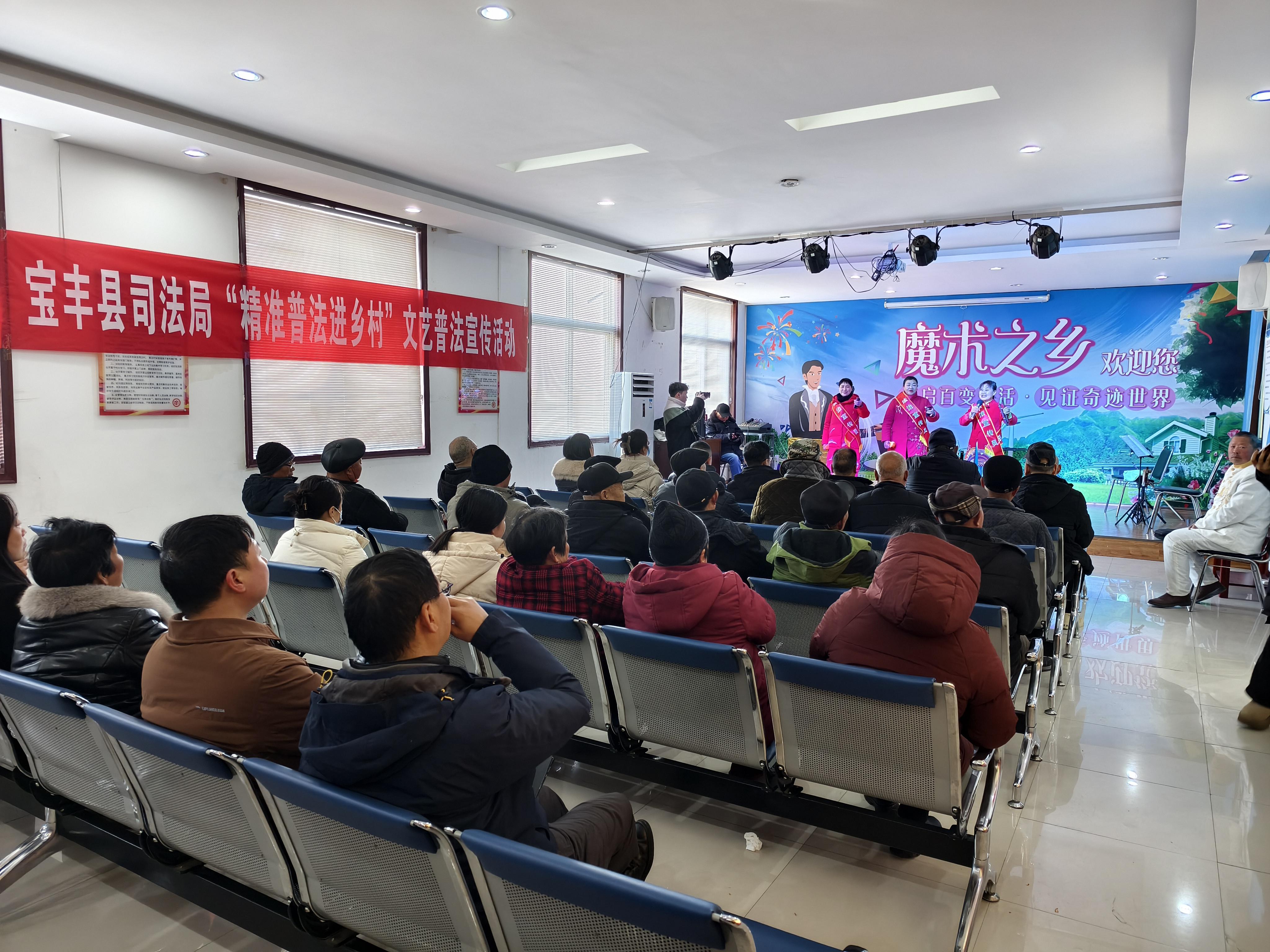 站在多功能教室門口,東邊靠墻設(shè)置成一個(gè)寬約5米、進(jìn)深約3米、高約0.2米的小舞臺(tái),舞臺(tái)背景墻“魔術(shù)之鄉(xiāng)”四個(gè)大字格外醒目。其他空間擺放著8排椅子,每排8個(gè)位子,基本上坐滿了村民。背面墻上掛著一條紅色橫幅——寶豐縣司法局“精準(zhǔn)普法進(jìn)鄉(xiāng)村”文藝普法宣傳活動(dòng)。