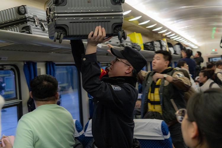 為了滿足大量旅客的出行需求,K27次列車特別增設(shè)至16節(jié)車廂,全車載有超過1000名旅客。沃荻從協(xié)助旅客托運(yùn)行李,到確保行李擺放整齊、安全;從白天維持車廂內(nèi)秩序,到夜間巡查提醒旅客保管好個人財物……旅途中的每一件小事,他都親力親為,從不馬虎。