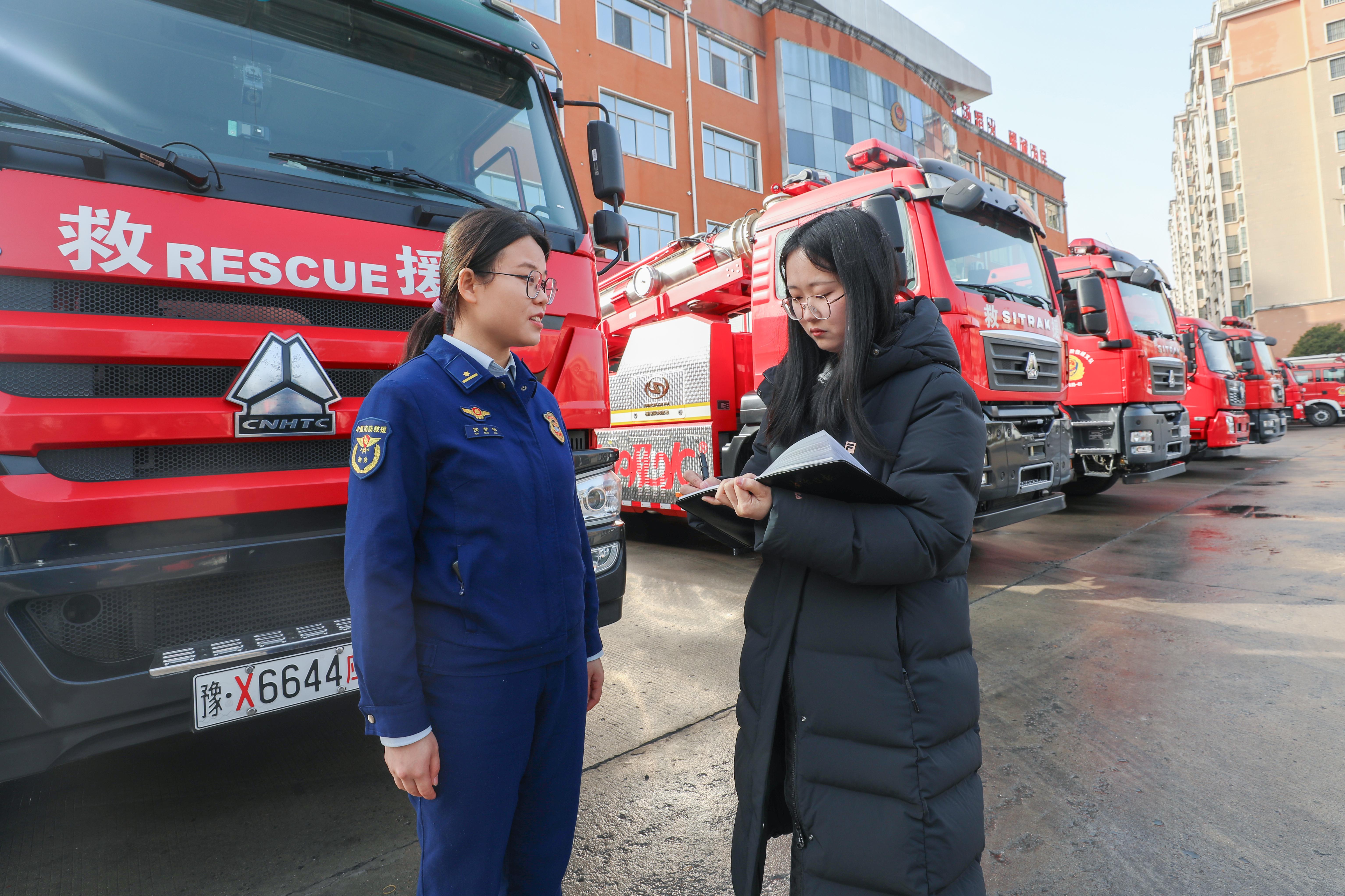 圖為川匯區(qū)消防救援大隊初級專業(yè)技術(shù)職務(wù)侯夢華(左)向記者介紹川匯區(qū)消防救援大隊有關(guān)情況。法治日報通訊員 鄧碩宇 攝