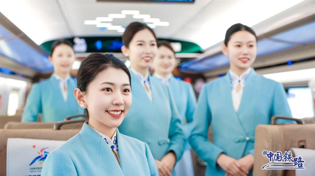 列車上,乘務(wù)員身著帶有雪花刺繡的藍(lán)白衣裙,熱情、得體地與乘客交流。車廂內(nèi)印有亞冬會元素的時刻表、貼紙隨處可見,營造出濃厚的冰雪體育盛會氛圍。