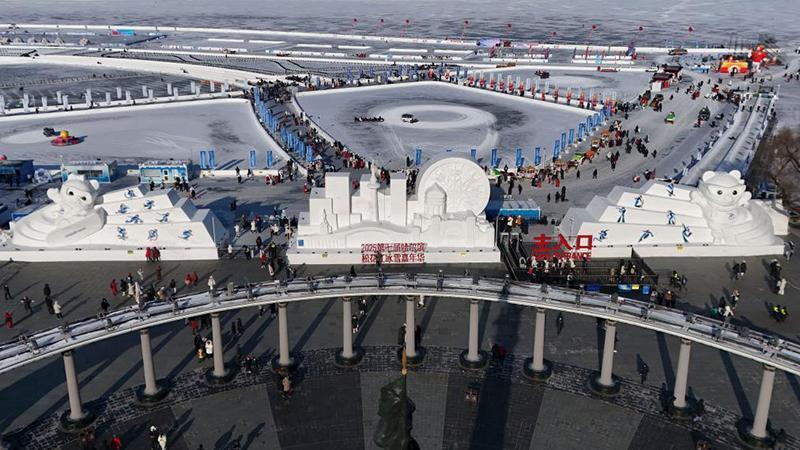 這是1月8日在哈爾濱道里區(qū)的防洪紀(jì)念塔廣場拍攝的亞冬會吉祥物雪雕“濱濱”和“妮妮”(無人機照片)。新華社記者 王松 攝