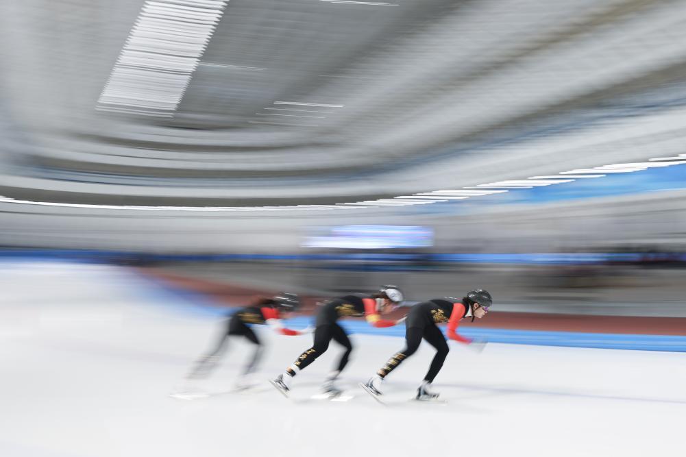 2024年12月15日,2024-2025賽季中國杯速度滑冰精英聯(lián)賽第四站暨亞冬會測試賽女子團體追逐比賽在黑龍江省冰上訓練中心舉行。新華社記者 張濤 攝