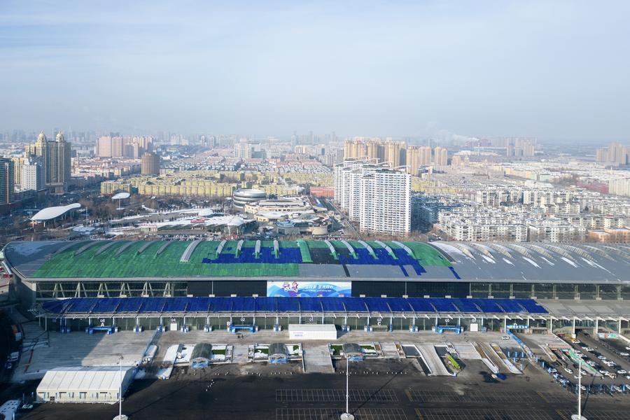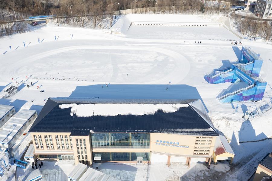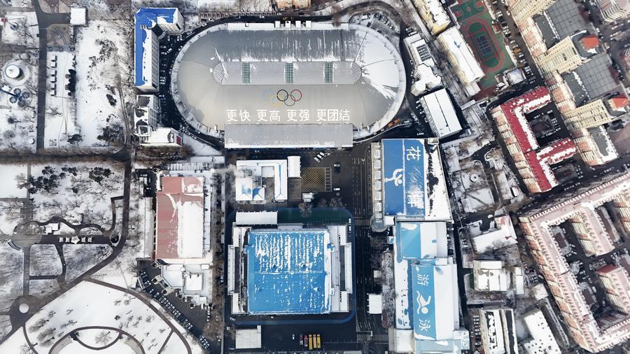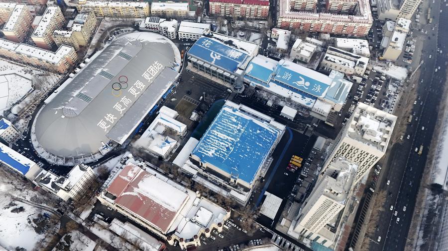 這是1月21日拍攝的黑龍江省冰上訓(xùn)練中心綜合館(短道速滑、花樣滑冰比賽場(chǎng)館)(無人機(jī)照片)。新華社記者 王松 攝