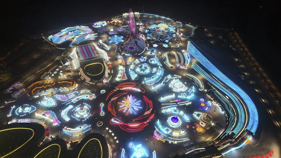 這是1月26日拍攝的第二十六屆哈爾濱冰雪大世界園區(qū),這里將作為亞冬會(huì)開幕式的分會(huì)場(chǎng)(無人機(jī)照片)。新華社記者 王松 攝