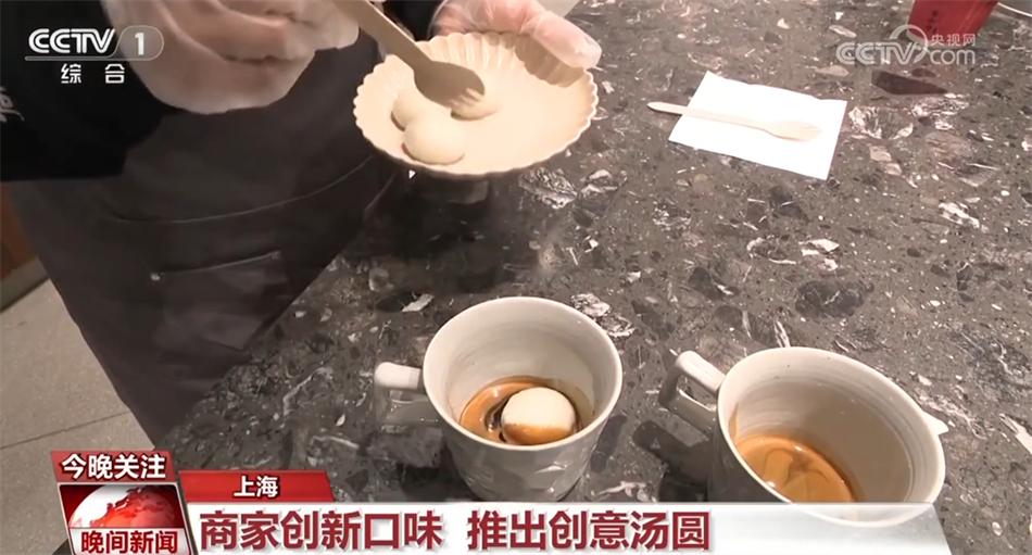今年,不少商家還追求“新奇”與“融合”。在上海淮海中路的這家咖啡店,推出的一款“美式湯圓”這幾天受到不少顧客的關(guān)注。所謂“美式湯圓”,就是湯圓泡在了咖啡里,顧客點(diǎn)單后,后廚工作人員開始現(xiàn)煮芝麻湯圓,前臺(tái)咖啡師則同步萃取濃縮咖啡。待湯圓煮好以后,以濃縮咖啡液作底,放入軟糯的白湯圓,再撒上“靈魂輔料”桂花碎,一杯充滿混搭氣息的“美式湯圓”就做好了。
