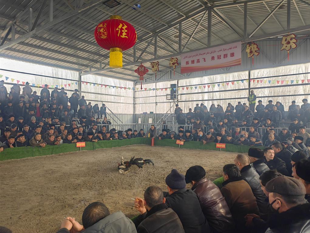 1月5日,在新疆喀什市牛羊大巴扎,觀眾在觀看斗雞比賽。新華社記者蔡國(guó)棟 攝