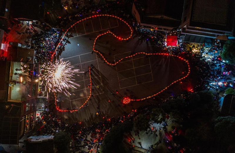 2月10日,赤松鎮(zhèn)虎巖村村民抬著板凳龍,開始進(jìn)行晚上的巡游(無人機照片)。新華社記者徐昱 攝