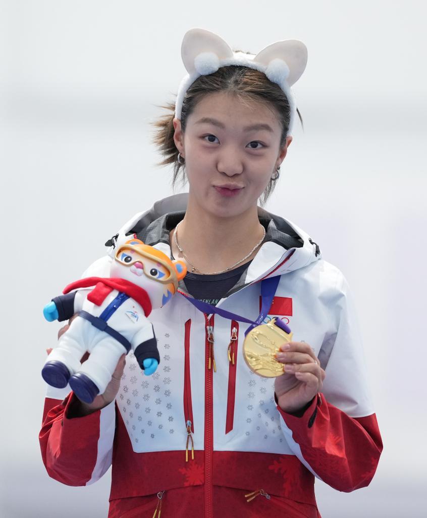 2月11日,冠軍中國隊選手楊濱瑜在頒獎儀式上。當日,第九屆亞冬會速度滑冰女子團體追逐比賽頒獎儀式在哈爾濱舉行。新華社記者 李一博 攝