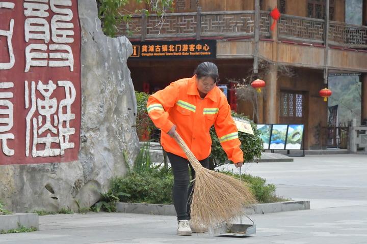 圖為冉友瓊在龔灘古鎮(zhèn)北門廣場打掃清潔。(受訪者供圖)
