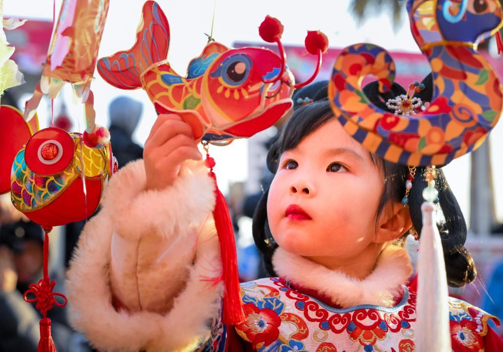 2月9日,一名小朋友在浙江省寧波市寧??h強蛟鎮(zhèn)峽山村迎元宵節(jié)活動中專注賞燈。新華社發(fā)(胡學軍攝)