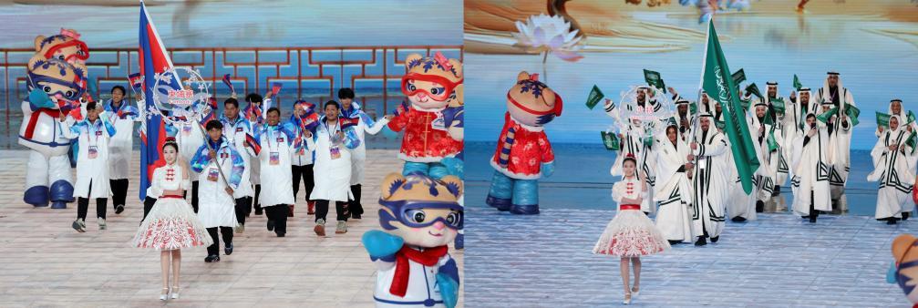 2月7日,第九屆亞洲冬季運動會開幕式在哈爾濱舉行。圖為柬埔寨體育代表團(左)和沙特阿拉伯體育代表團在開幕式上入場。新華社記者 楊磊 攝