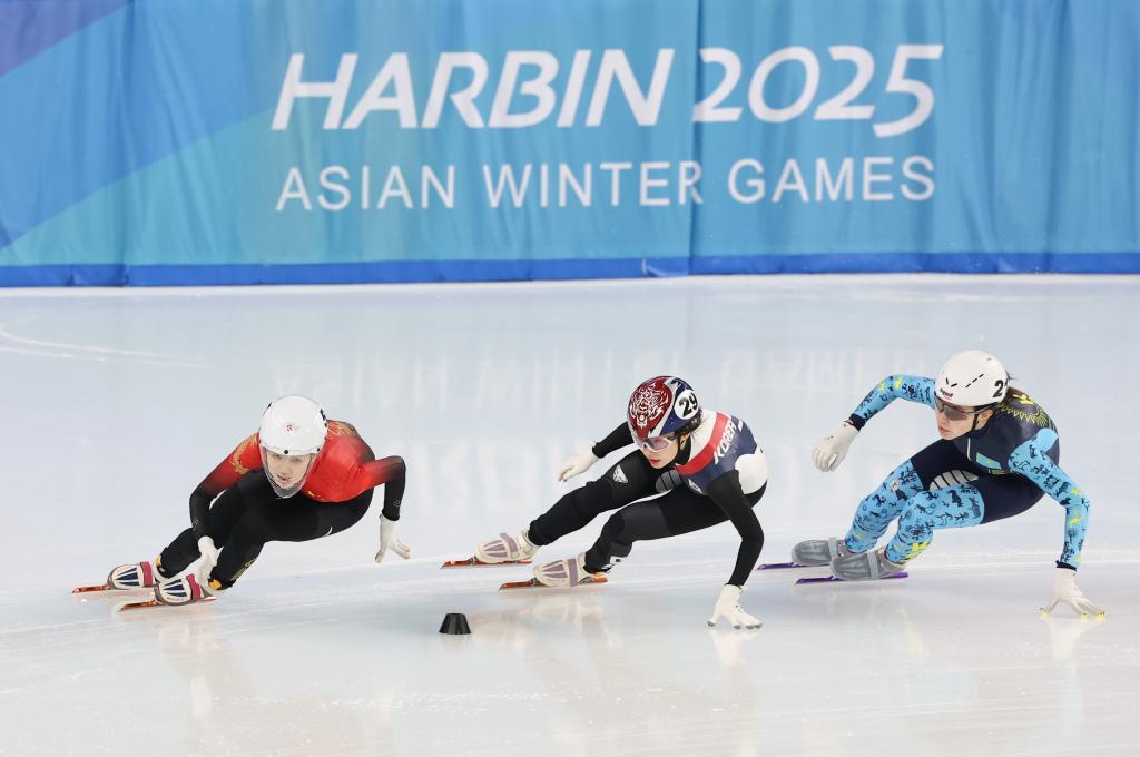 2月9日,中國隊選手王欣然(左)在比賽中。當日,第九屆亞冬會短道速滑女子3000米接力A組決賽在哈爾濱舉行,中國隊奪得冠軍。新華社記者 楊磊 攝