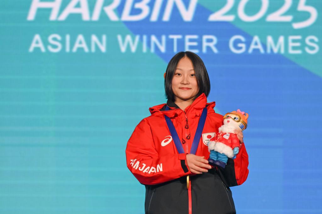 2月13日,日本選手清水笑良在頒獎儀式上。當日,第九屆亞冬會單板滑雪女子U型場地技巧比賽決賽因大風天氣取消,最終按照預賽成績決定獎牌歸屬。新華社記者 連振 攝