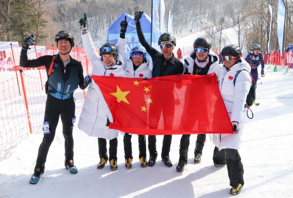2月12日,中國隊選手賽后合影慶祝。當日,第九屆亞冬會滑雪登山混合接力決賽在亞布力舉行。中國組合次旦玉珍/布魯爾、于婧萱/畢禹新、索朗曲珍/劉建賓分別獲得冠、亞、季軍。新華社記者 楊青 攝