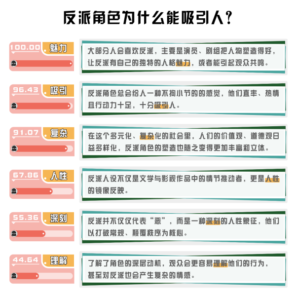 小紅書平臺(tái),搜集“為什么反派角色更吸引人?”相關(guān)貼文,整理分析后發(fā)現(xiàn),演員出色的演技是刻畫反派角色的基礎(chǔ)。令觀眾著迷的,往往是反派角色身上的多面性,反派角色的“惡”并不僅僅是字面意思,它是一種復(fù)雜的、深刻的人性象征,更像是一道令人捉摸不透的難解謎題。