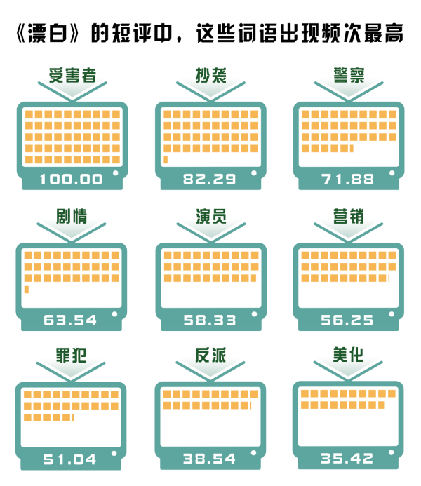 (制作:法治網(wǎng)輿情中心 數(shù)據(jù)來源:選取400條《漂白》豆瓣短評(píng),對(duì)短評(píng)做分詞及歸一化處理,進(jìn)行分詞后將熱度最高的詞語規(guī)定為100)