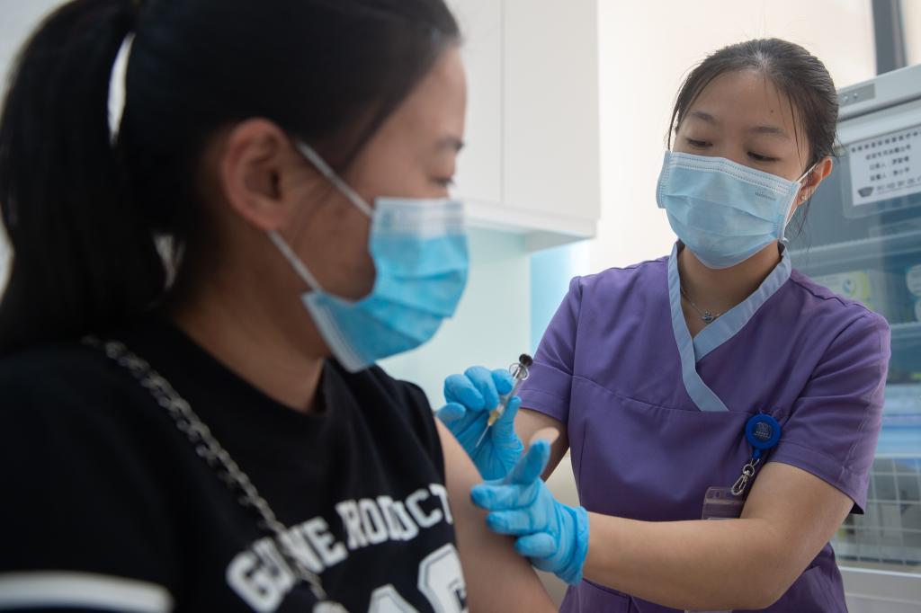 2020年4月3日,博鰲超級(jí)醫(yī)院的護(hù)士給一位女士接種HPV疫苗。 新華社記者 張麗蕓 攝