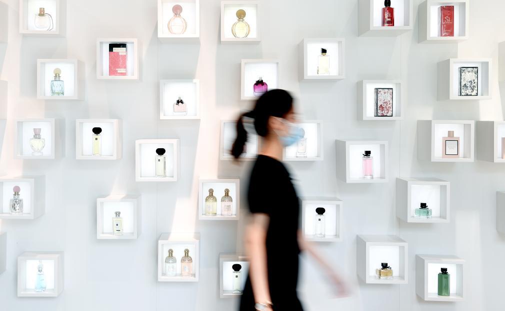 2021年4月19日,消費(fèi)者從海南博鰲免稅店的香水柜臺(tái)前經(jīng)過(guò)。新華社記者 郭程 攝