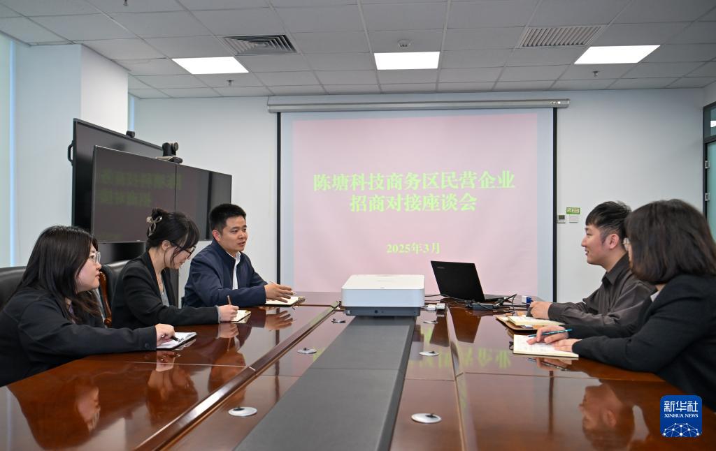 3月28日,在天津陳塘科技商務(wù)區(qū)管理委員會,工作人員就商務(wù)區(qū)招商工作進行討論。