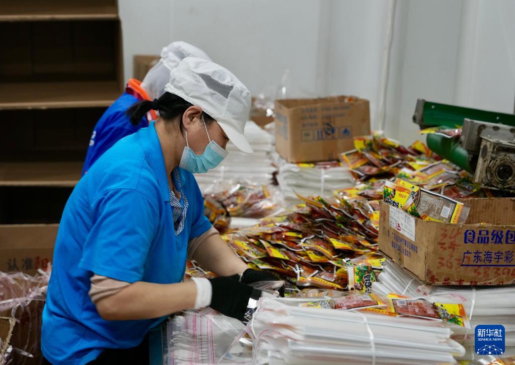 4月8日,在沈陽(yáng)市陽(yáng)陽(yáng)食品有限公司,工人將辣條打包裝箱。