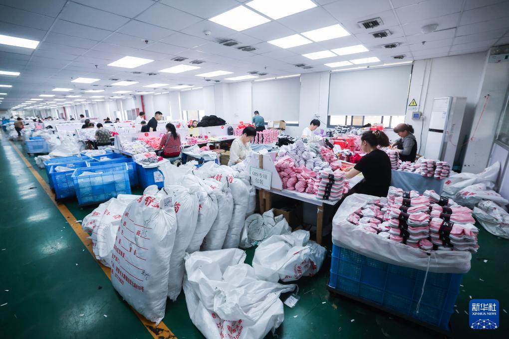 4月10日,在諸暨市緣錦針織有限公司的流水線上,工人在打包出口國外市場(chǎng)的襪子。