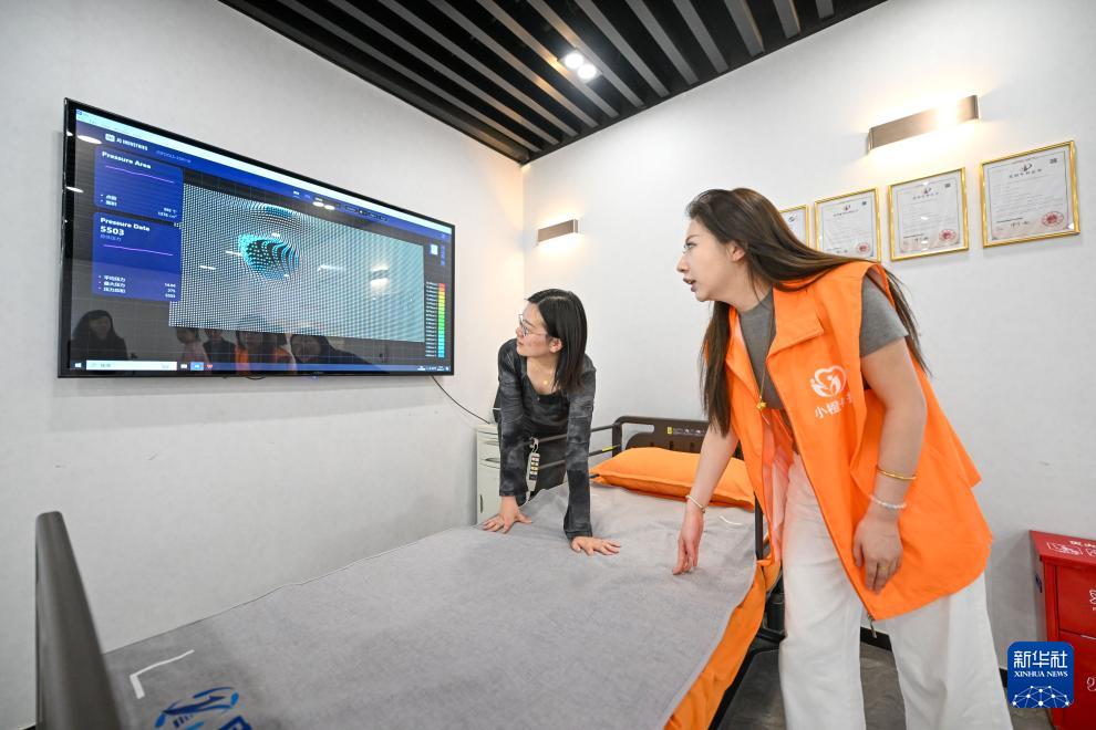 在天津小橙集團(tuán)有限公司,工作人員展示一款安裝有傳感器的纖維床墊(4月18日攝)。該床墊可通過終端設(shè)備直觀查看床墊受力壓力數(shù)值,被應(yīng)用于居家養(yǎng)老等服務(wù)場(chǎng)景。