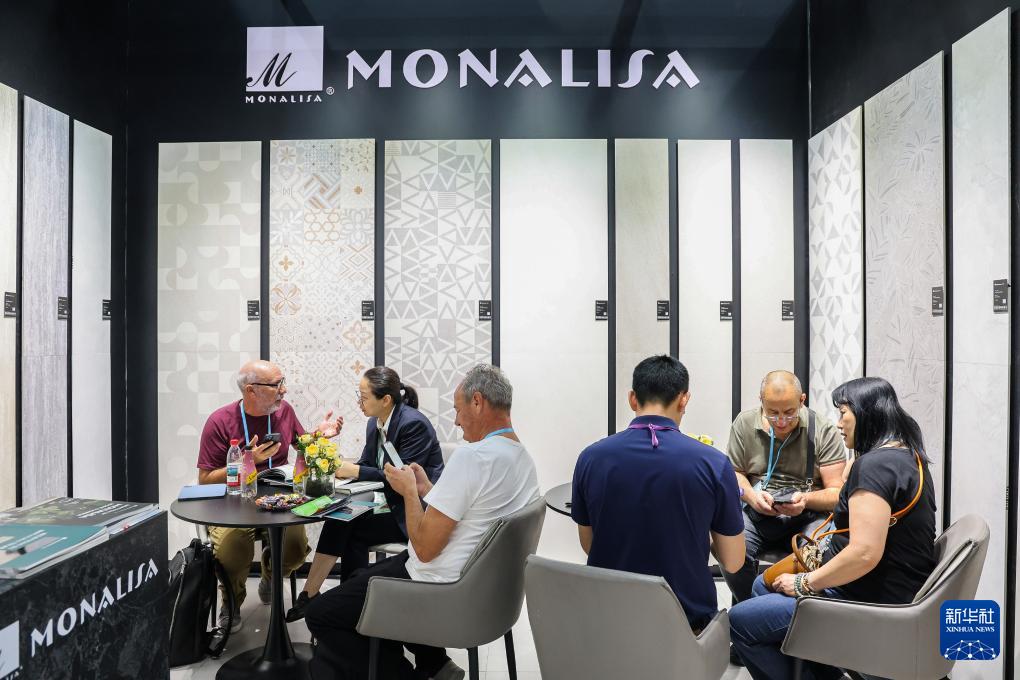 4月23日,采購商在第137屆廣交會蒙娜麗莎陶瓷展位洽談。
