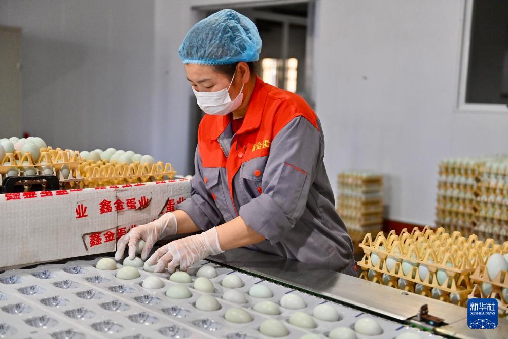 4月24日,在位于遼陽市的遼寧鑫金科技實業(yè)集團有限公司的加工廠內(nèi),工人將鴨蛋碼放到生產(chǎn)線上。