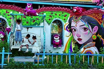 兒童在新疆伊犁特克斯縣一家手工冰激凌店前玩耍。光明日報記者 閆匯芳攝
