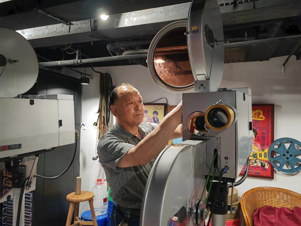 在光影瑯琊·中國(guó)百年電影文化體驗(yàn)館,館長(zhǎng)鞏西吉正在調(diào)試?yán)鲜诫娪胺庞硻C(jī)。新華社記者劉錚 攝