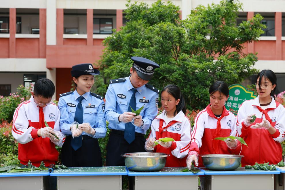 活動(dòng)現(xiàn)場(chǎng),民警與學(xué)生們圍坐在一起,手把手教孩子們包粽子。“粽葉要折成漏斗狀,米不能放太多,就像法律給我們的保護(hù),既要周全也要適度?!泵窬贿吺痉叮贿厡⒚穹ǖ渲信c未成年人相關(guān)的條款融入講解。小小的粽子裹進(jìn)了防霸凌、防溺水的小貼士,孩子們?cè)隗w驗(yàn)傳統(tǒng)文化的同時(shí),潛移默化地學(xué)習(xí)了法律知識(shí)。